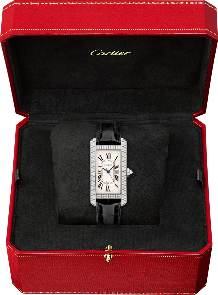 Tank Américaine watch, medium model, mechanical self-winding movement. Case in rhodium-finish 18K white gold set with 142 brilliant-cut diamonds and faceted crown set with a brilliant-cut diamond, totalling 1.37 carats. Silvered flinqué dial. Sword-shaped hands in blued steel. Mineral crystal. Strap in shiny black alligator skin with 14 mm double adjustable folding buckle in rhodium-finish 18K white gold. Case dimensions: 41.6 mm x 22.6 mm. Case thickness: 9.65 mm. Water-resistant to 30 metres/100 feet.