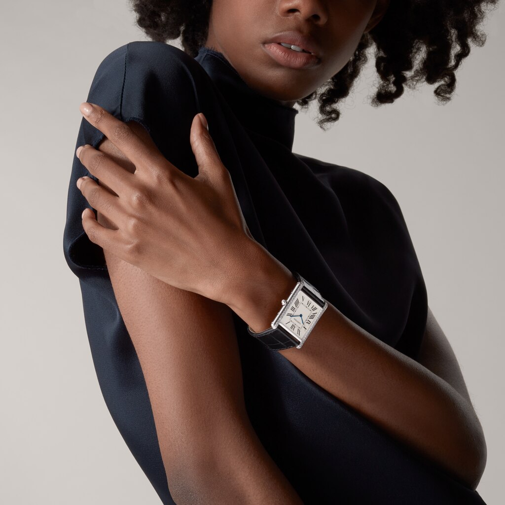 Tank Louis Cartier watch, XL, mechanical movement with manual winding Calibre 430 MC. Case in 18K rose gold set with 42 brilliant-cut diamonds and beaded crown set with a brilliant-cut diamond, totalling 0.92 carats. Silvered grained dial. Sword-shaped hands in blued steel. Mineral crystal. Strap in brown semi-matt alligator skin with 18 mm double adjustable folding buckle in 18K rose gold. Case dimensions: 40.4 mm x 34.9 mm. Case thickness: 5.1 mm. Water-resistant to 20 meters/60 feet.