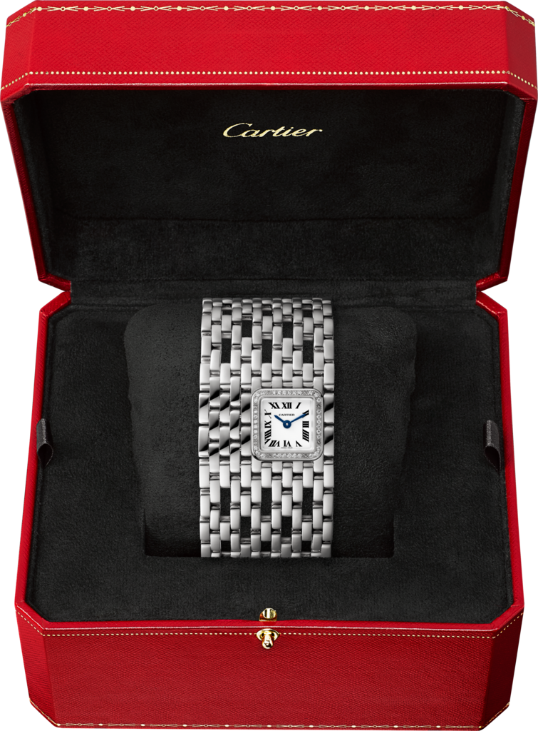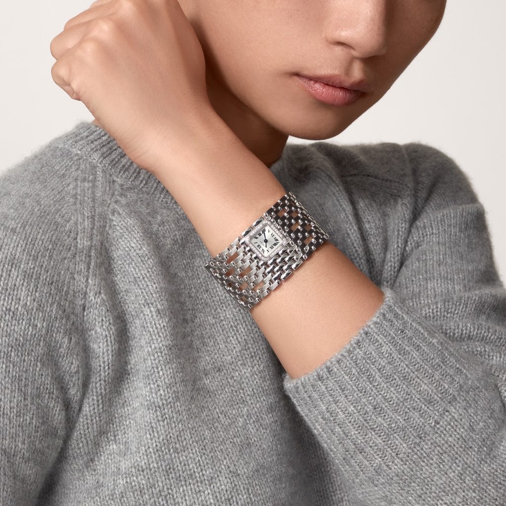 Panthère de Cartier manchette watch, quartz movement. 18-karat rhodium-plated white gold case and bracelet, bezel set with brilliant-cut diamonds. Silver dial, sword-shaped hands in blued steel, sapphire crystal. Case dimensions 22 x 19 mm, thickness 6 mm. Total width 31 mm. Waterproof up to 30 meters.