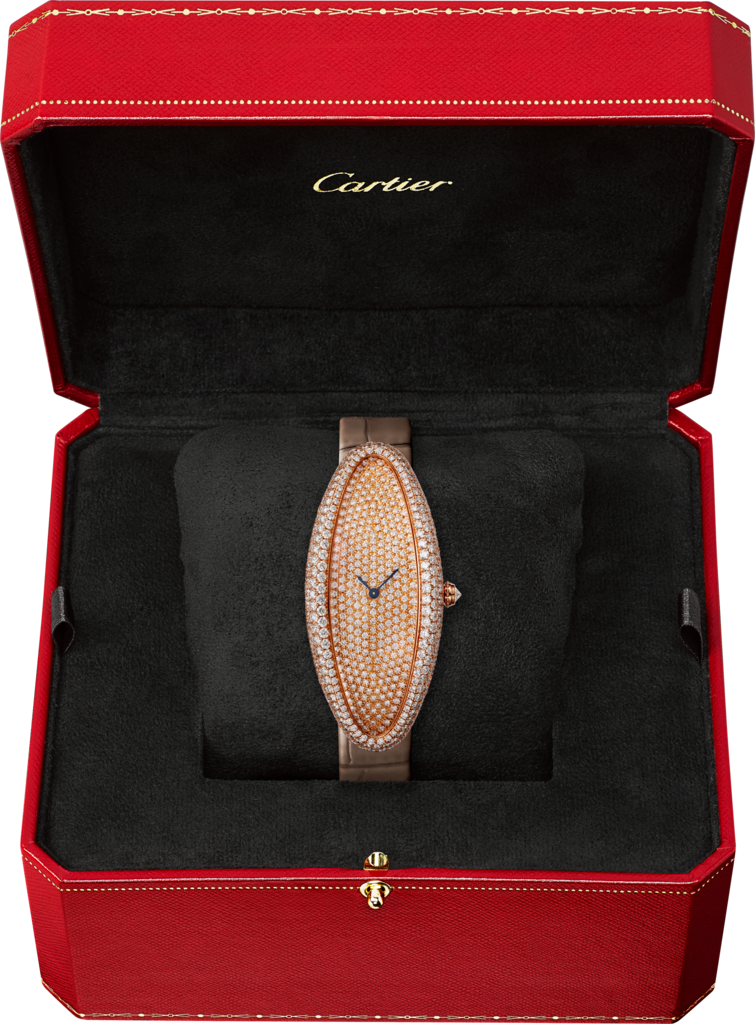 Baignoire Allongée watch, extra-large model, Manufacture mechanical movement with manual winding, caliber 1917 MC. Case and dial in 18k rose gold set with brilliant-cut diamonds. Pearly crown in 18-carat rose gold set with a brilliant-cut diamond. Sword-shaped hands of blued steel, sapphire crystal. Taupe alligator strap, 18-karat rose gold ardillon buckle set with brilliant-cut diamonds. Dimensions 52 x 23 mm, thickness 8 mm. Waterproof up to 30 meters.