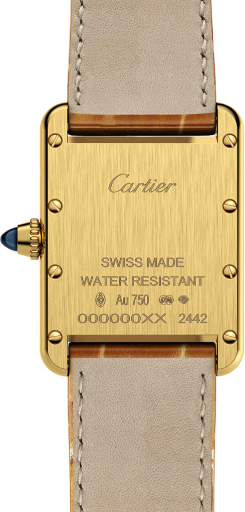 Tank Louis Cartier watch, small model, quartz movement. Case in 18K yellow gold, beaded crown set with a sapphire cabochon, silvered grained dial, sword-shaped hands in blued steel, mineral crystal, alligator-skin strap with ardillon buckle in 18K yellow gold. Case dimensions: 29.5 mm x 22 mm, 6.35 mm thick. Water-resistant to 30 metres/100 feet.