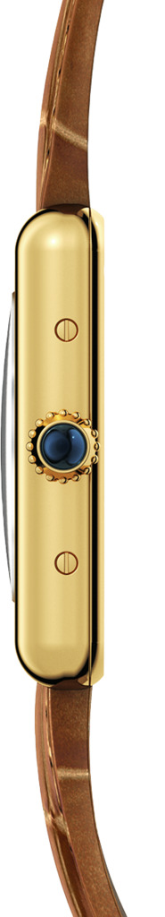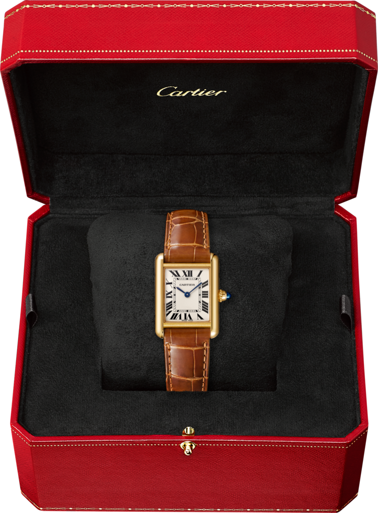 Tank Louis Cartier watch, small model, quartz movement. 18K yellow gold case, pearly crown set with a cabochon sapphire, silvered grained dial, blued steel sword-shaped hands, mineral glass, alligator strap, 18K yellow gold ardillon buckle. Case dimensions 29.5 x 22 mm, thickness 6.35 mm. Waterproof up to 30 meters.