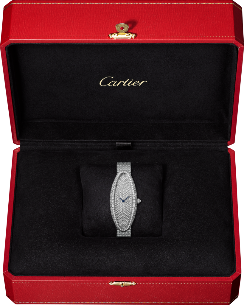 Baignoire Allongée watch, medium model, Manufacture mechanical movement with manual winding, calibre 1917 MC. Rhodium-finish 18K white gold case, bracelet and dial set with brilliant-cut diamonds. Rhodium-finish 18K white gold beaded crown set with a brilliant-cut diamond. Blued-steel sword-shaped hands, sapphire crystal. Dimensions: 47 mm x 21 mm. Thickness: 8 mm. Water-resistant to 3 bar (approx. 30 metres).