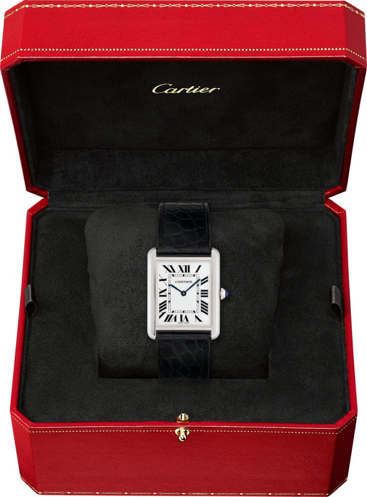 Tank Solo watch, large model, quartz movement. Steel case, beaded crown set with a synthetic spinel cabochon, clear silvered opaline dial, Roman numerals, sword-shaped hands in blued steel, sapphire crystal, strap in alligator skin with round scales, double adjustable folding steel buckle. Case dimensions: 34.8 mm x 27.4 mm, thickness: 5.55 mm. Water-resistant to 30 metres/100 feet.