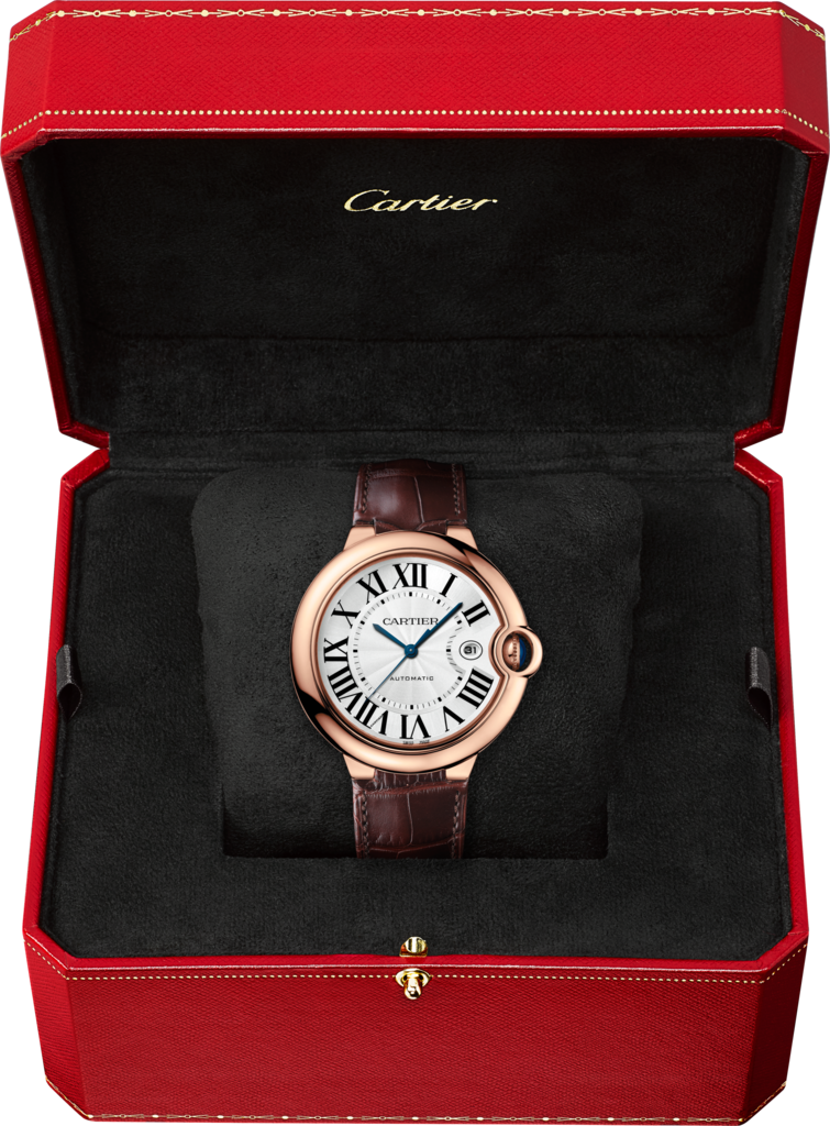 Ballon Bleu de Cartier watch, 42 mm, mechanical self-winding movement. 18K rose gold case, fluted crown decorated with a blue sapphire cabochon, lacquered silvered guilloché opaline dial, Roman numerals, blued-steel sword-shaped hands, sapphire crystal, alligator-skin strap with double adjustable folding 18K rose gold buckle, calendar aperture at 3 o'clock. Case dimensions: diameter: 42.1 mm, thickness: 13 mm. Water-resistant to 3 bar (approx. 30 metres).