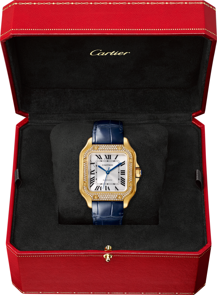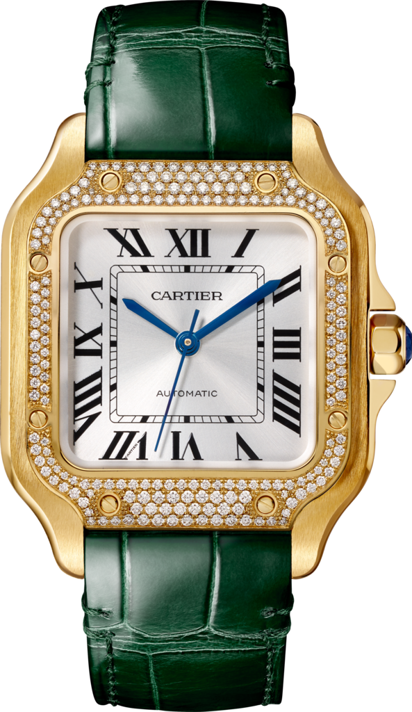 Santos watch, medium model, mechanical movement with automatic winding, calibre 1847 MC. 18K yellow gold case, bezel set with brilliant-cut diamonds. 18K yellow gold 7-sided crown set with a faceted sapphire, sunray-effect dial, blued-steel sword-shaped hands, sapphire crystal. Two alligator-skin straps with the “QuickSwitch” interchangeability system, double adjustable folding buckle in 18K yellow gold. Case width: 35.1 mm, case thickness: 8.83 mm. Water-resistant to 10 bar (approx. 100 metres).
