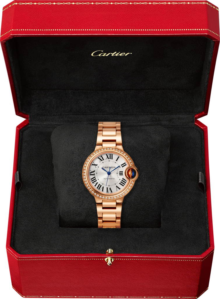 Ballon Bleu de Cartier watch, 33 mm, mechanical movement with automatic winding. 18K rose gold case set with 47 brilliant-cut diamonds totalling 0.68 carats. Fluted crown decorated with a cabochon sapphire. Silvered sunray-brushed dial. Blued-steel sword-shaped hands. Sapphire crystal. Interchangeable 18K rose gold bracelet. Thickness: 9.96 mm. Water-resistant to 3 bar (approx. 30 metres).