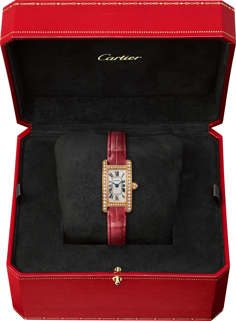 Tank Américaine watch, mini model, quartz movement. 18K rose gold case and octagonal crown set with 47 brilliant-cut diamonds totalling 0.44 carat, silvered flinqué dial, blued-steel sword-shaped hands, shiny claret alligator-skin strap, 18K rose gold ardillon buckle. Case dimensions: 27.00 mm x 15.20 mm, thickness: 6.50 mm. Water-resistant to 3 bar (approx. 30 metres).