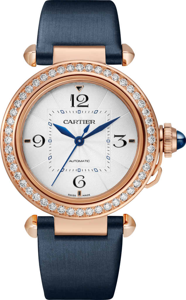 Pasha de Cartier watch, 35 mm, mechanical movement with automatic winding, caliber 1847 MC. Case in 18K pink gold, bezel set with 48 brilliant-cut diamonds (1.15 carats), fluted crown cover and crown set with sapphires, silvered flinqué dial, diamond-shaped hands in blued steel, 18k rose gold bracelet carat with SmartLink size adjustment system, second strap in navy blue satin calfskin, interchangeable folding buckle in 18K rose gold. Both are equipped with the QuickSwitch interchangeability system. Case diameter 35 mm, thickness 9.37 mm. Waterproof up to 100 meters.
