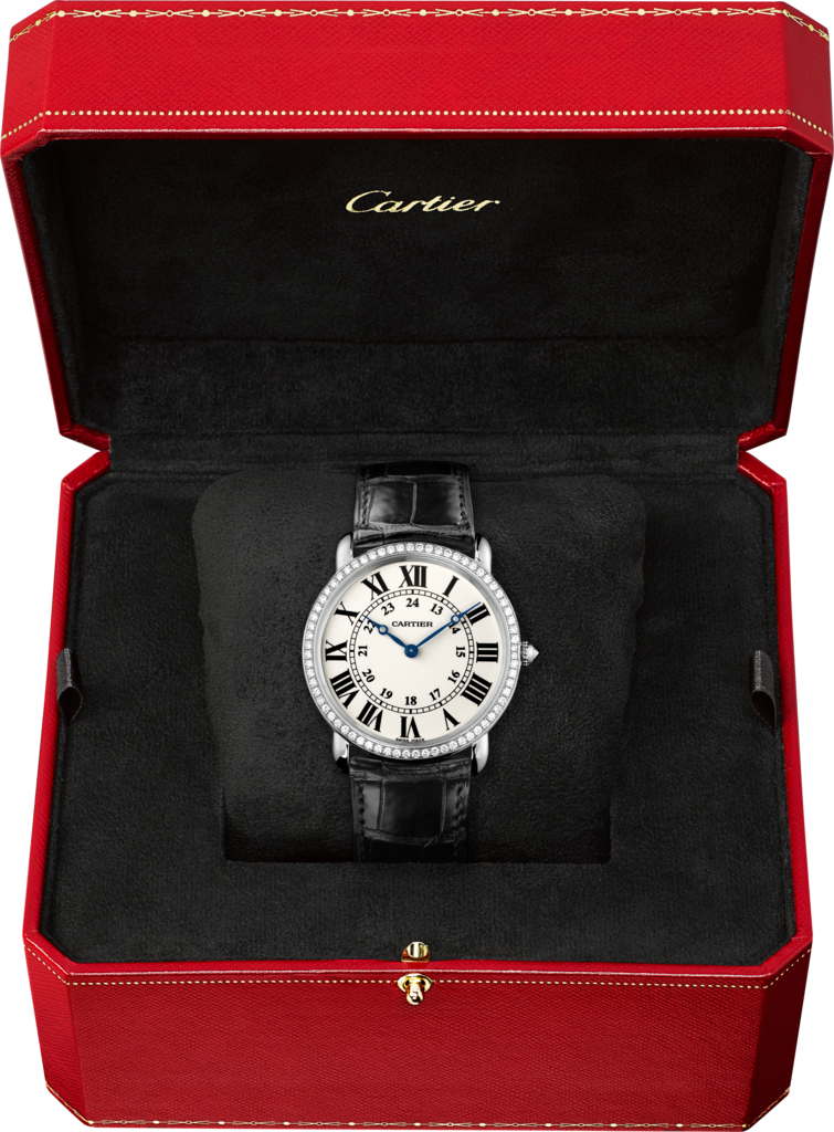 Ronde Louis Cartier watch, large model, 36 mm diameter. Mechanical movement with manual winding calibre 430 MC. Case in 18K white gold set with 68 brilliant-cut diamonds and beaded crown set with a brilliant-cut diamond, totalling 0.73 carats. Silvered grained dial. Apple-shaped hands in blued steel. Sapphire crystal. Strap in black semi-matt alligator skin with 18 mm adjustable folding buckle in rhodium-finish 18K white gold. Sapphire case back. 6.51 mm thick. Water-resistant to 30 metres/100 feet.