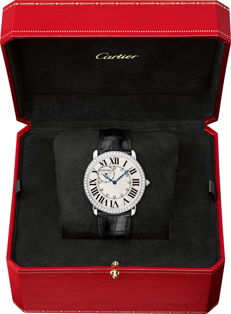 Ronde Louis Cartier watch, extra-large model, 42 mm diameter. Mechanical movement with manual winding calibre 9754 MC. Case in rhodium-finish 18K white gold set with 60 brilliant-cut diamonds and beaded crown set with a brilliant-cut diamond, totalling 1.53 carats. Silvered flinqué dial. Apple-shaped hands in blued steel. Sapphire crystal. Strap in black matt alligator skin with 18 mm adjustable folding buckle in rhodium-finish 18K white gold. Small seconds at 10 o'clock. Sapphire case back. 7.25 mm thick. Water-resistant to 30 metres.