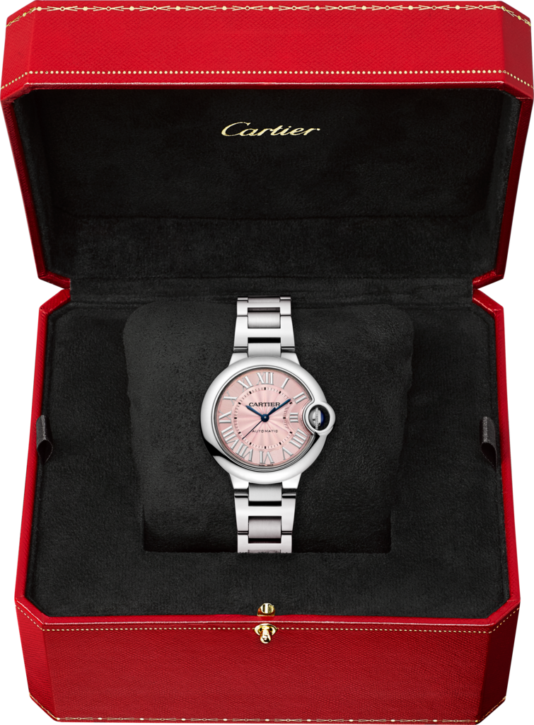 Ballon Bleu de Cartier watch, 33 mm, self-winding mechanical movement. Steel case, fluted crown set with a synthetic cabochon spinel, pink dial, Roman numerals, blued steel sword-shaped hands, sapphire crystal, steel bracelet. Case thickness 9.96 mm. Waterproof up to 30 meters.