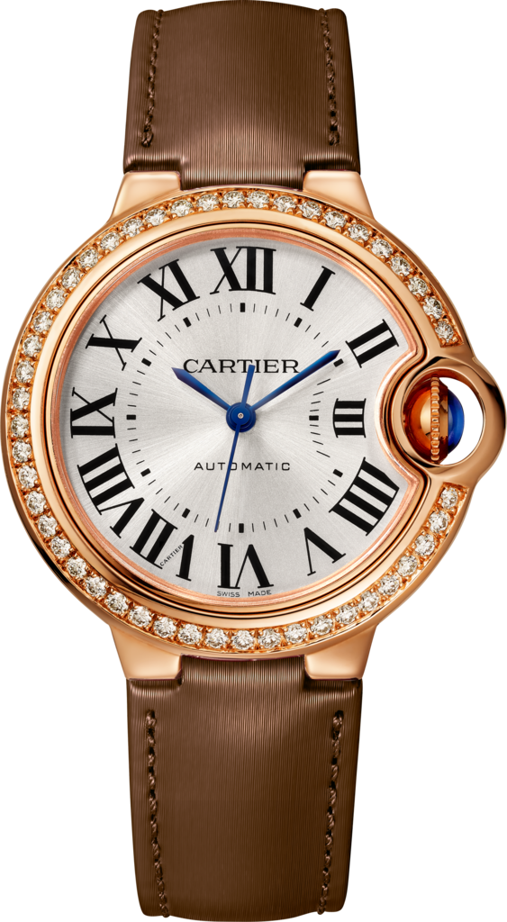 Orologio Ballon Bleu de Cartier, 33 mm. Movimento meccanico a carica automatica. Cassa in oro rosa 18 carati ornata di 47 diamanti taglio brillante (0,68 carati). Corona scanalata ornata di uno zaffiro cabochon. Quadrante argentato effetto soleil. Lancette a forma di gladio d’acciaio azzurrato. Vetro zaffiro. Due cinturini in pelle di vitello spazzolata effetto satinato, bordeaux e marrone, fibbia ardiglione in oro rosa 18 carati. Spessore della cassa 10 mm. Impermeabile fino a 30 metri.