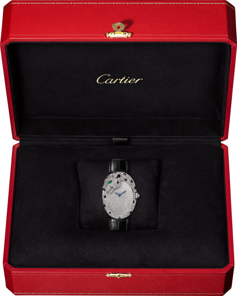 Orologio Panthère Lovée, movimento meccanico a carica automatica, calibro 530 MC. Cassa in oro bianco rodiato 18 carati ornata di 438 diamanti taglio brillante (1,78 carati), macchie in lacca nera, occhio di smeraldo forma poire, quadrante galuchat ornato di 499 diamanti taglio brillante (1,19 carati), corona ornata di un diamante taglio brillante (0,20 carati), lancette a forma di gladio d’acciaio azzurrato, cinturino d’alligatore lucido nero (cinturino supplementare d’alligatore lucido verde scuro), fibbia ardiglione in oro bianco rodiato 18 carati ornata di 21 diamanti taglio brillante (0,20 carati). Impermeabile fino a 30 metri.