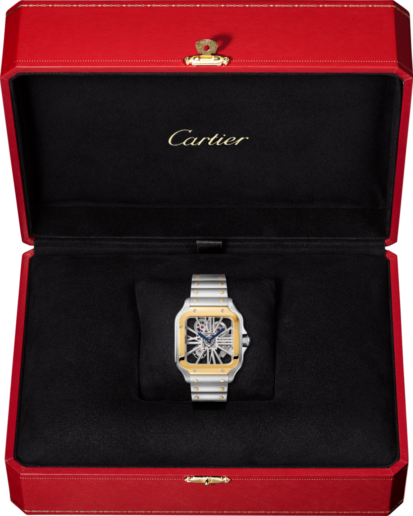 Orologio Santos Scheletrato, modello grande, movimento meccanico di Manifattura a carica manuale, calibro 9611 MC. Cassa in acciaio, lunetta in oro giallo 18 carati, corona ettagonale ornata di uno zaffiro sfaccettato, lancette a forma di gladio d’acciaio azzurrato, vetro e fondocassa in vetro zaffiro. Bracciale in acciaio con sistema di regolazione della misura SmartLink. Secondo cinturino in pelle di alligatore, fibbia pieghevole a doppia regolazione in acciaio. Entrambi sono dotati del sistema d’intercambiabilità QuickSwitch. Ore, minuti con ponti scheletrati a forma di numeri romani. Movimento con numerazione individuale, 138 componenti e 20 rubini. Dimensioni 28 x 28 mm, spessore 3,97 mm, bilanciere a 28.800 alternanze/ora, riserva di carica di circa 72 ore. Larghezza della cassa 39,8 mm, spessore: 9,08 mm. Impermeabile fino a 100 metri.